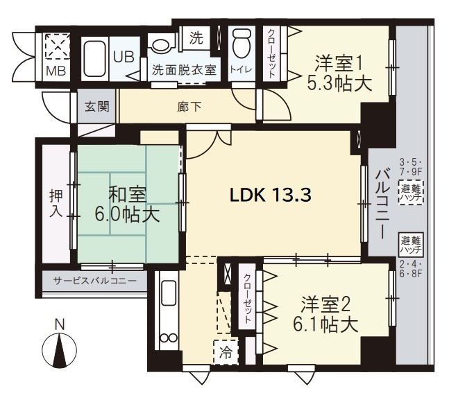 | 間取り詳細 | 洋6.1×洋5.3×和6×LDK13.3 | 現況 | 空室 |